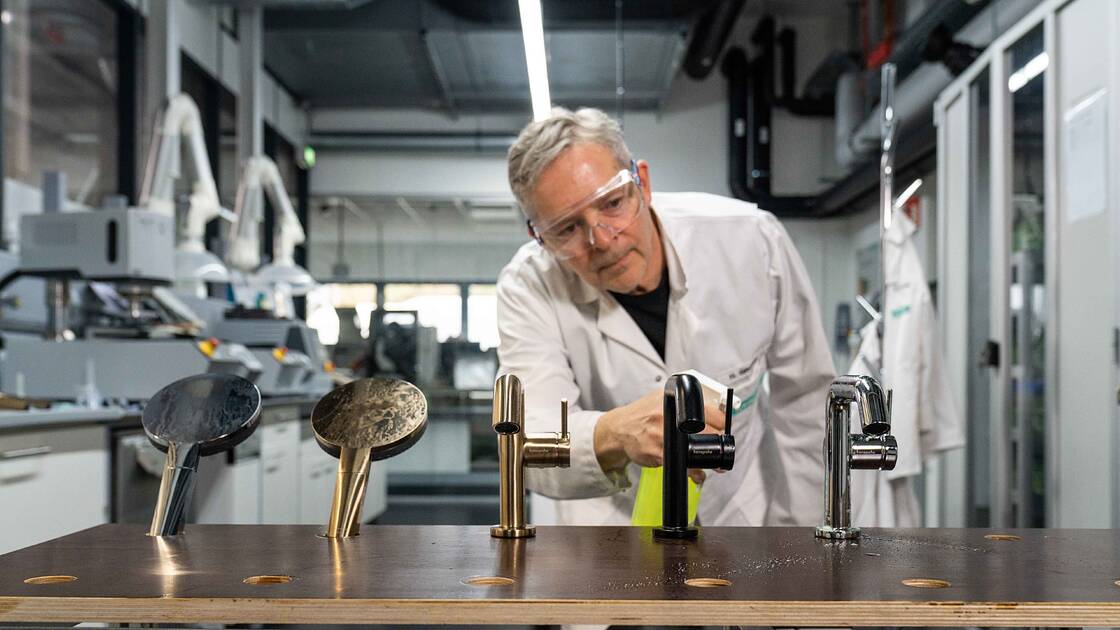 Bei etlichen Dingen, die wir in Sachen ,,Produktqualität” tun, liegen wir über der Norm. Das heißt: Wir haben uns selbst Richtlinien und hansgrohe Normen auferlegt, die über die gesetzlichen Anforderungen hinausgehen. Unsere Produkte werden streng geprüft – von Ingenieursteams und von Menschen, die sie täglich nutzen. Im hauseigenen Hansgrohe Labor werden Armaturen und Brausen, Thermostate oder Küchenzubehör extremen Bedingungen ausgesetzt, um Haltbarkeit, Funktionalität, Dauergebrauch und Beständigkeit gegenüber Haushaltschemikalien zu prüfen. Wie wir das machen? Zum Beispiel so: